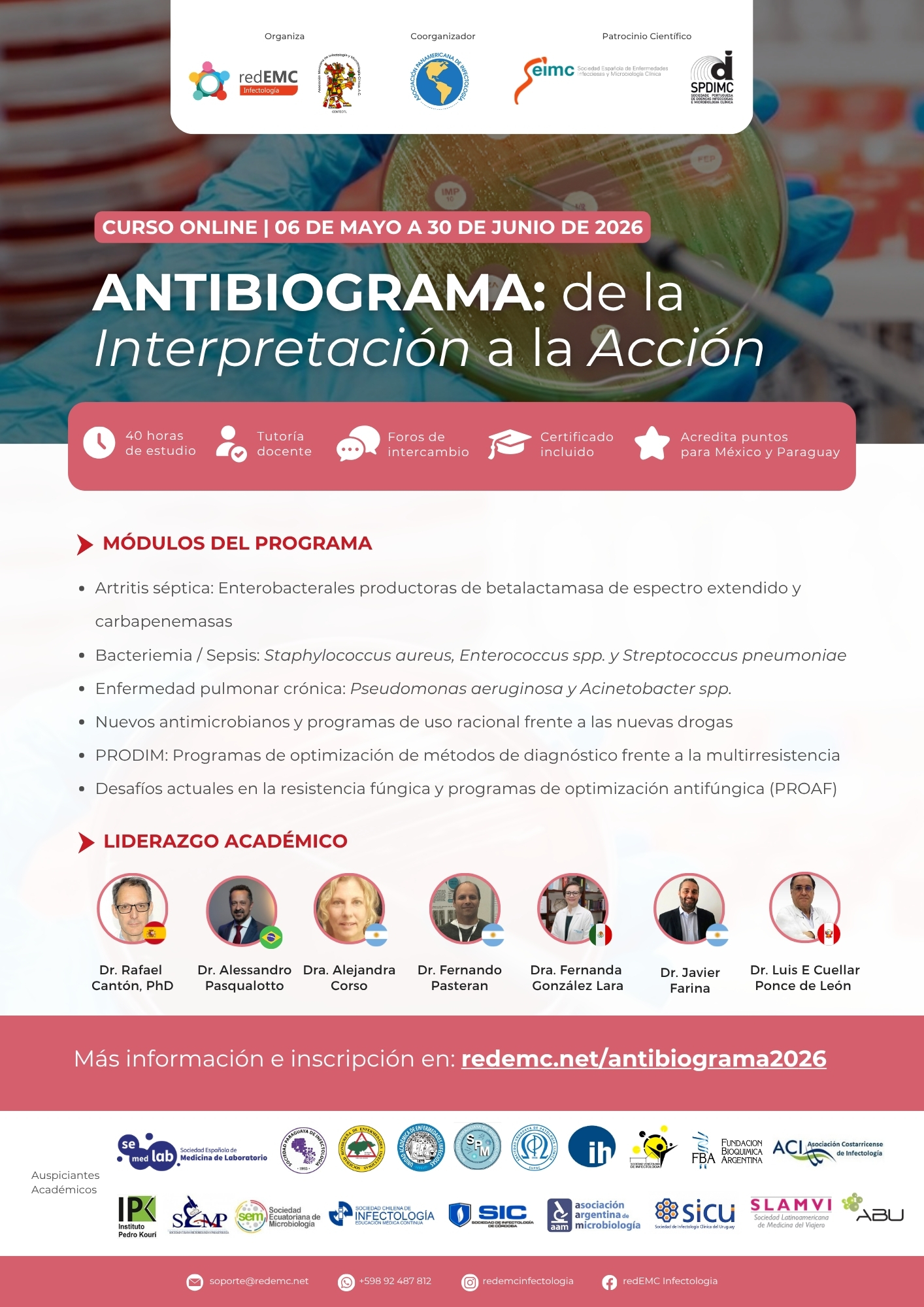La propuesta aborda temáticas clave como infecciones por bacterias multirresistentes, interpretación clínica del antibiograma, nuevos antimicrobianos y programas de optimización del uso de antibióticos, entre otros.