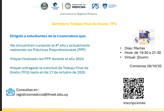 La Licenciatura en Registros Médicos de la Facultad de Medicina de la Universidad de la República  anuncia la convocatoria al Seminario de Trabajo Final de Grado (TFG).