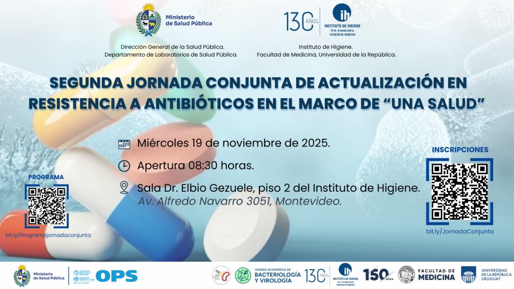 El próximo miércoles 19 de noviembre de 2025 se llevará a cabo la Segunda Jornada Conjunta de Actualización en Resistencia a Antibióticos en el marco de «Una Salud», organizada por el Departamento de Laboratorios de Salud Pública del Ministerio de Salud Pública (MSP) y el Instituto de Higiene de la Facultad de Medicina, Universidad de la República.